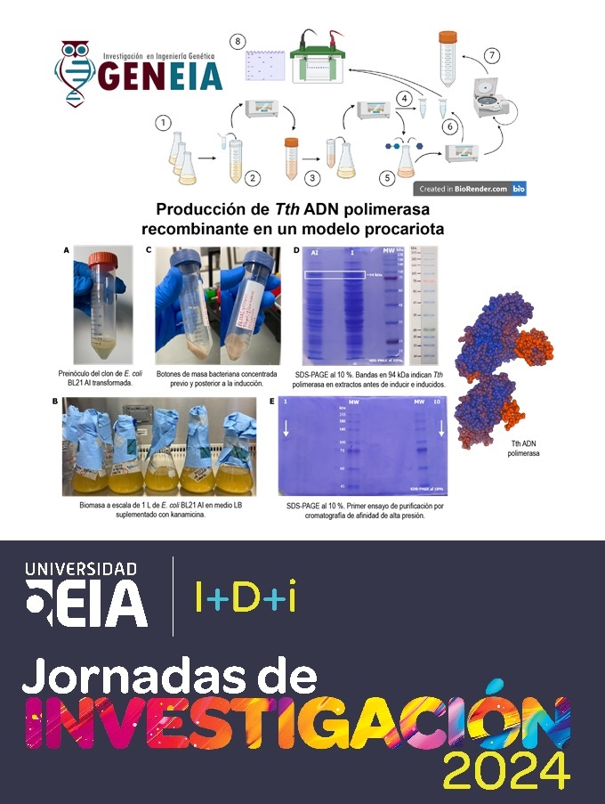 | dc.description.abstract | Los biotecnológicos son macromoléculas producidas mediante la tecnología ADN recombinante con aplicaciones industriales significativas. En Colombia, la demanda de proteínas recombinantes, como la Tth ADN polimerasa utilizada en PCR, no está cubierta por una industria local, lo que resulta en altos costos. Este estudio se enfoca en estandarizar la producción a escala analítica de Tth ADN polimerasa recombinante en E. coli BL21-AI, a partir de la determinación de las condiciones óptimas de crecimiento del hospedero transformado con un plásmido, las condiciones de inducción de la expresión de la enzima, la evaluación de la producción mediante SDS-PAGE, y la purificación del producto. El protocolo incluyó la preparación de medios selectivos con kanamicina, activación del clon de E. coli desde un stock de glicerol, preinóculo, y almacenamiento de células pre- y post-inducción. La inducción se hizo con L-arabinosa e IPTG, seguida de cosecha, purificación con cromatografía de afinidad y evaluación por SDS-PAGE. Los resultados preliminares consisten en la producción de la biomasa en medios de cultivo inducidos y suplementados con kanamicina a escala de 1 L, observándose bandas de aproximadamente 94 kDa en el SDS-PAGE, correspondientes a la Tth polimerasa, tras el análisis electroforético de la masa bacteriana concentrada antes y después de inducir y tras la purificación. Estos resultados preliminares indican que el sistema de producción de la enzima recombinante es funcional, con viabilidad confirmada del clon productor y recuperación de la enzima tras inducción. Sin embargo, es necesario optimizar las condiciones de almacenamiento post-fermentación y purificación para maximizar la cantidad de proteína pura obtenida. | spa |