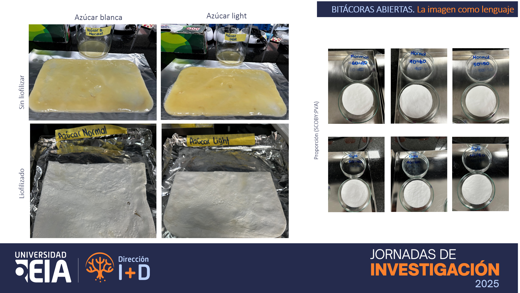 La contaminación por plásticos de un solo uso representa un desafío ambiental crítico, especialmente en la industria de alimentos, donde los empaques desechables son ampliamente utilizados. En respuesta a esta problemática, este proyecto propone el uso de celulosa bacteriana producida por cultivos simbióticos de bacterias y levaduras (SCOBY), obtenidos del cultivo de kombucha, como una alternativa biodegradable y sostenible para la fabricación de empaques. El proceso inicia con la fermentación de un medio nutritivo a base de té y una fuente de carbono. Aunque el azúcar es el sustrato tradicional, se podría evaluar residuos orgánicos como cáscaras de frutas y otros desechos agroindustriales como materia prima, lo que permite reducir costos, promover la economía circular y mejorar la sostenibilidad del proceso. Durante la fermentación, se forma una película gelatinosa de celulosa bacteriana sobre la superficie del medio, la cual es cosechada, purificada y liofilizada para su caracterización.. Adicionalmente, se evaluó la mezcla de la celulosa obtenida con polivinil alcohol (PVA) con el fin de analizar los cambios en las propiedades de la celulosa bacteriana al mezclarse con otros polímeros biodegradables. A las películas obtenidas se le realizaron pruebas que incluyen análisis físico-mecánicos, químicos y microbiológicos, con el fin de determinar su viabilidad como material de empaque. Además, se estudian los subproductos del proceso fermentativo, como la presencia de ácidos orgánicos y compuestos fenólicos con propiedades antioxidantes, lo que abre la posibilidad de integrar un modelo de biorrefinería para aprovechar todo el potencial del cultivo. El enfoque inicial está orientado hacia empaques biodegradables de alimentos, con un diseño que permita compostabilidad y reducción del impacto ambiental. Sin embargo, el proyecto plantea una futura diversificación hacia sectores de mayor valor agregado, como biomateriales para dispositivos médicos, tejidos y farmacéutica.