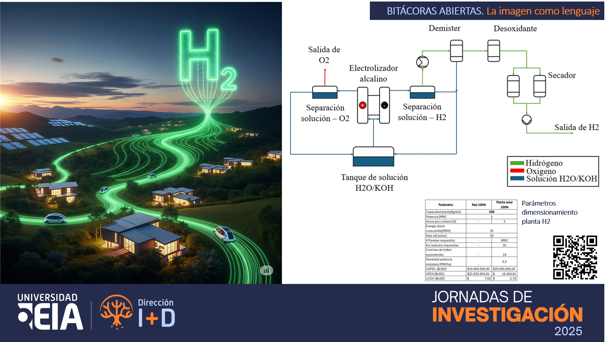 El hidrógeno verde, obtenido mediante electrólisis del agua utilizando fuentes de energía renovable, se considera la alternativa más limpia para la producción de hidrógeno, gracias a su baja huella de carbono. Según el Banco Interamericano de Desarrollo (BID), el país tiene un alto potencial para liderar la producción de hidrógeno verde, debido a su abundante disponibilidad de recursos renovables y de agua. Esta investigación evalúa la viabilidad económica de producir hidrógeno verde en Colombia, comparando los costos de electrólisis alimentada por energías renovables con los de la electrólisis conectada a la red eléctrica nacional, para una capacidad de producción de 500kg de hidrógeno diario.