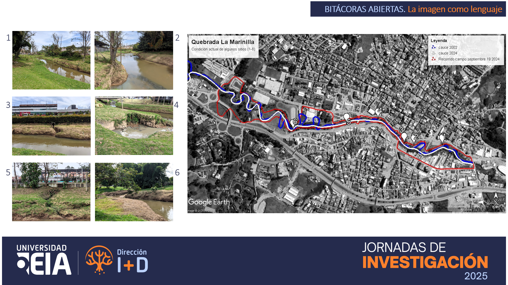 Los ríos tienen su propia dinámica evolutiva. Sin embargo, en su paso por las ciudades, pueden llegar a sufrir cambios antrópicos en su alineamiento en un afán de la sociedad humana por controlarlos o dominarlos. Si la sociedad reconociera el beneficio de conservar los ríos y quebradas en su estado natural, otra sería la situación de sus cauces en el paso por las ciudades. En un intento por analizar la condición de los cauces, especialmente en las ciudades y pueblos del departamento de Antioquia, se propuso este proyecto, con el objetivo de vigilar las actuaciones pasadas y presentes, y proponer medidas de conservación para el futuro por su importancia ecológica y socioeconómica. Siendo Antioquia un departamento rico en ríos, tiene el potencial para destacar por el manejo adecuado de los mismos y mostrarse como ejemplo de ello. El presente proyecto en curso es el desarrollo de lo planteado para los ríos de Antioquia llevado a cabo sobre el caso particular de la quebrada La Marinilla. En los municipios de Antioquia, muchos de los cauces de ríos y quebradas que pasan cerca del casco urbano han sido intervenidos modificando su alineamiento natural y ocupando sus llanuras. Estos cambios se asocian con riesgos hidráulicos sobre la infraestructura y las viviendas, pérdida de biodiversidad, deterioro del paisaje, y en general una falta de integración de los cauces con los elementos de la planificación urbana. Hacer conciencia sobre esta problemática propicia diseñar las ciudades de una manera más amigable con el medio ambiente, mejorando la biodiversidad, el paisaje y el bienestar socioeconómico en general. Se han encontrado algunos cambios geomorfológicos en la quebrada La Marinilla, en el tramo (de 6.2 km) comprendido entre el puente de la carrera 25 hasta su desembocadura en el río Negro. A partir de imágenes de Google Earth de 2002 y 2024, se han identificado cinco cortes de meandro en el tramo del casco urbano comprendido entre las carreras 25 y 43. Esto ha significado la disminución de la relación de sinuosidad de 1.27 a 1.11 en el tramo 1, de 2.13 a 1.49 en el tramo 2, y de 1.79 a 1.40 en el tramo 4. Quizás debido a las alteraciones en los tramos 2 y 4, la sinuosidad pudo aumentar en el tramo 3, de 2.05 a 2.17. Algunos espacios de estos meandros han sido ocupados por infraestructura. Se identificaron también algunos puntos del canal en el tramo del casco urbano que requieren de intervenciones de estabilización mediante la aplicación de técnicas de restauración de ríos con soluciones naturales. Especial atención debe darse a varias descargas de aguas, algunas cerca de los estribos de los puentes. Algunas canalizaciones, como la ubicada entre las carreras 41 y 44 podrían haberse evitado y todavía podría ser restaurada a una condición natural. En todo el trayecto entre las carreras 25 y 43 las bancas están desprovistas de árboles, cuyas raíces podrían contribuir a su estabilización, además de darle al espacio elementos que favorecen el paisaje y la biodiversidad, no solo de flora sino de fauna.